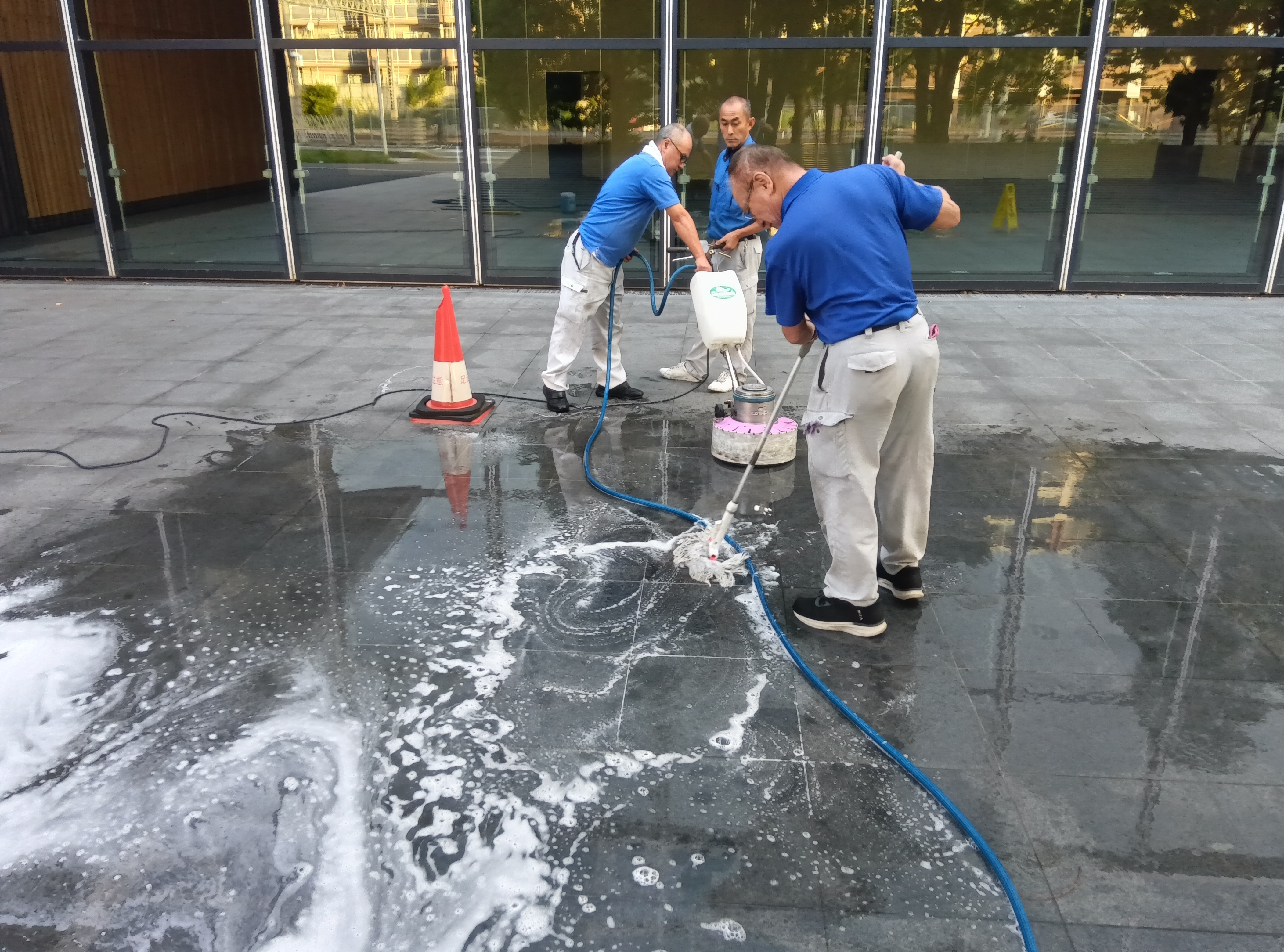 高圧洗浄用の機材は現場でよく見かけるマシンだと思いますが、屋外の階段と広場で行いました。